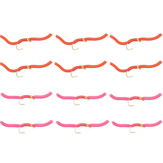 Twelve fish-catching machines, ready to go. These Squirmy Worms have insane movement in the water and get eaten fast — especially in high water, dirty conditions, or when you just want to stack numbers. This pack includes red and pink in size 12, giving you two of the most proven colors in one of the most effective flies ever tied. Whether you're running them under an indicator or tight to the bottom, these flies flat-out catch fish.