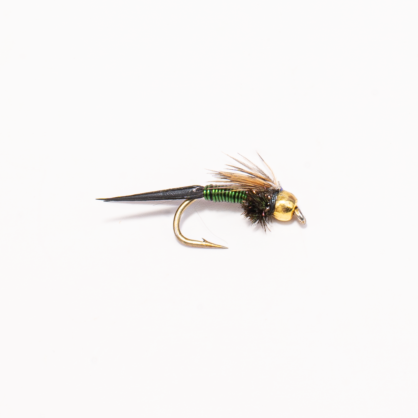 A heavy nymph with a wire-wrapped body that sinks fast and stays deep. The green color adds a subtle flash that draws strikes in clear or bright conditions. A solid choice for getting down to feeding fish in rivers and creeks.