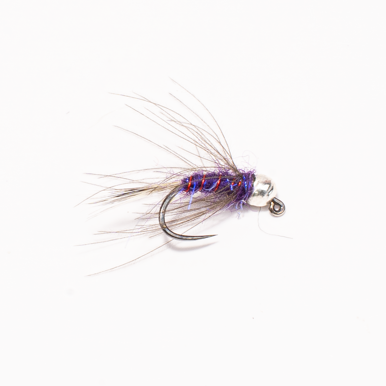 A modern jig-style euro nymph built for fast sinks and solid hookups. The purple body and tungsten bead make it stand out in clear or stained water. Tough, reliable, and perfect for tight-line or indicator nymphing in moving water.